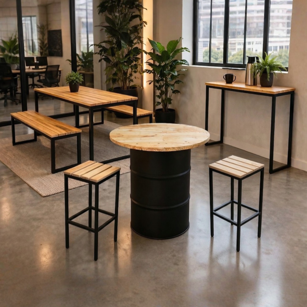 O Kit Gourmet Industrial é o conjunto completo para empresas e estabelecimentos que querem criar um espaço de convivência com personalidade, resistência e estilo. Reúne quatro peças de mobiliário industrial em ferro e madeira pinus, pensadas para ambientes de alto tráfego e uso intenso, sem abrir mão do impacto visual.