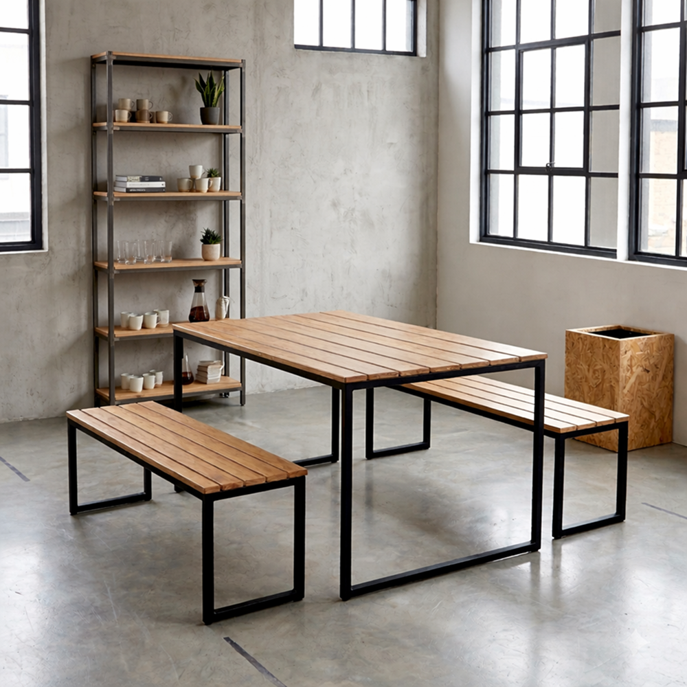 Estrutura metálica em ferro metalon com pintura PU de alta durabilidade. Madeira pinus de reflorestamento, lixada, higienizada e envernizada. Madeira OSB de reaproveitamento, tratada e pronta para uso. Todos os materiais são selecionados para resistir ao uso diário intenso de ambientes industriais.